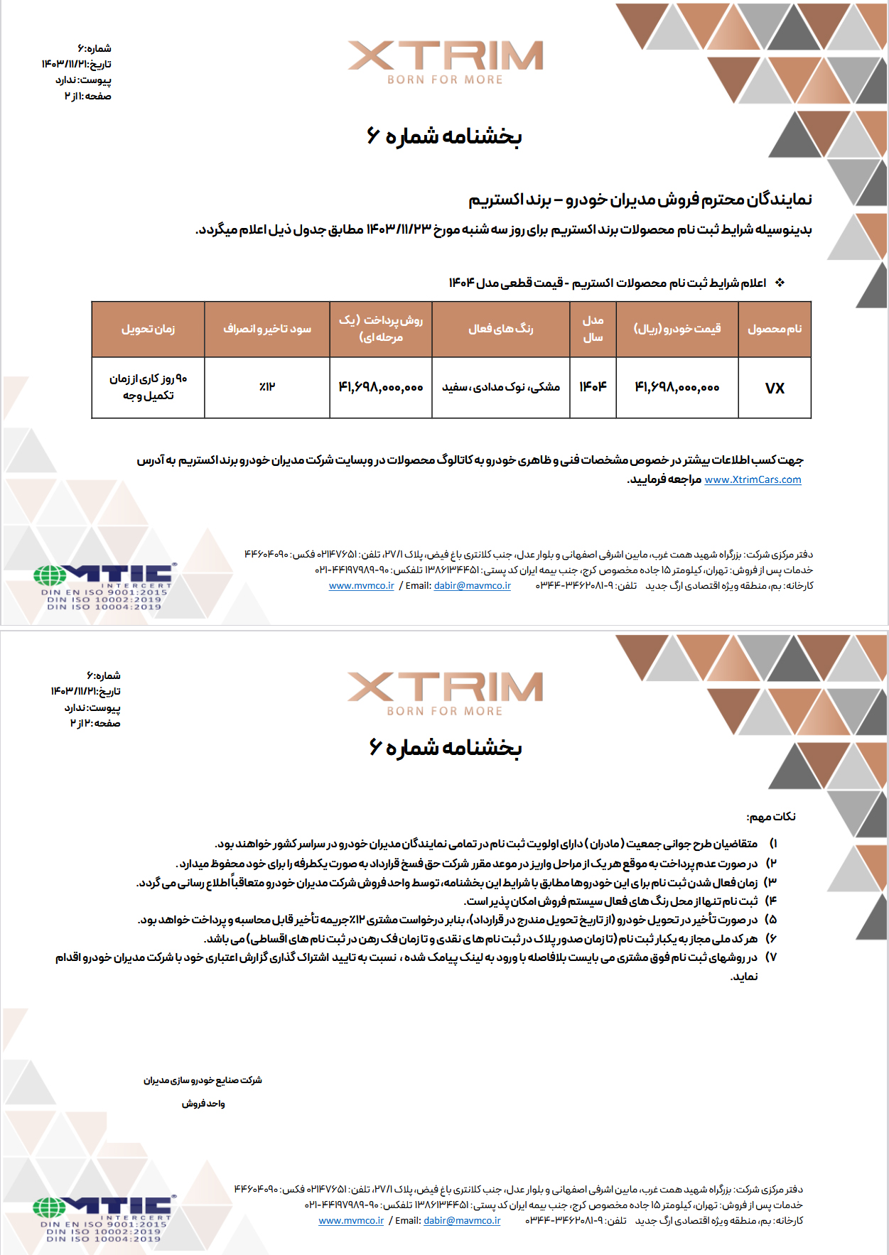 | اکستریم VX | 41.698.000.000 ریال | 1404 | مشکی، نوک مدادی، سفید | 41.698.000.000 | 12% | 90 روز کاری از زمان تکمیل وجه |