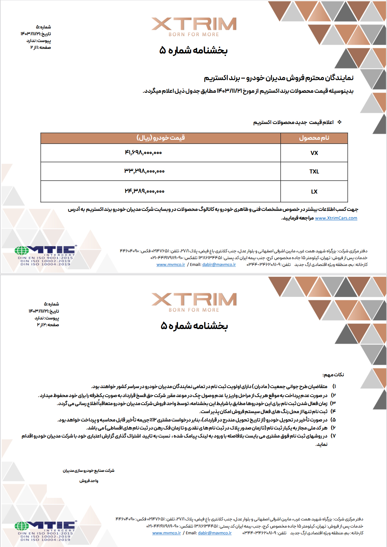 طبق بخشنامه شماره 5 منتشر شده از سوی شرکت مدیران خودرو در تاریخ 21 بهمن 1403 قیمت جدید محصولات مدیران خودرو - برند اکستریم اعلام گردید.