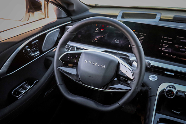 در بخش داخلی با یک طراحی مینیمال روبرو هستیم. دو کلاستر 12.3 اینچی خمیده داریم که در هنگام نور زیاد روز هم به خوبی و با وضوح مناسبی دیده می شوند. اهرم دنده به سبک ماشین های بنز در پشت فرمان تعبیه شده است. در داشبورد و کنسول میانی از جیر و چرم استفاده شده است که دوخت زیبایی دارند. بر روی کنسول میانی یک شارژر وایرلس دیده می شود.